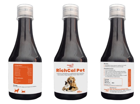 RGS RichCal Pet is a premium Calcium and Phosphorus supplement formulated to support the strong bone and joint health of dogs and cats. Enriched with Vitamins D3, K2, B12, and essential trace minerals, it promotes optimal skeletal growth, enhances metabolism, and maintains a balanced Ca:P ratio essential for active and growing pets.